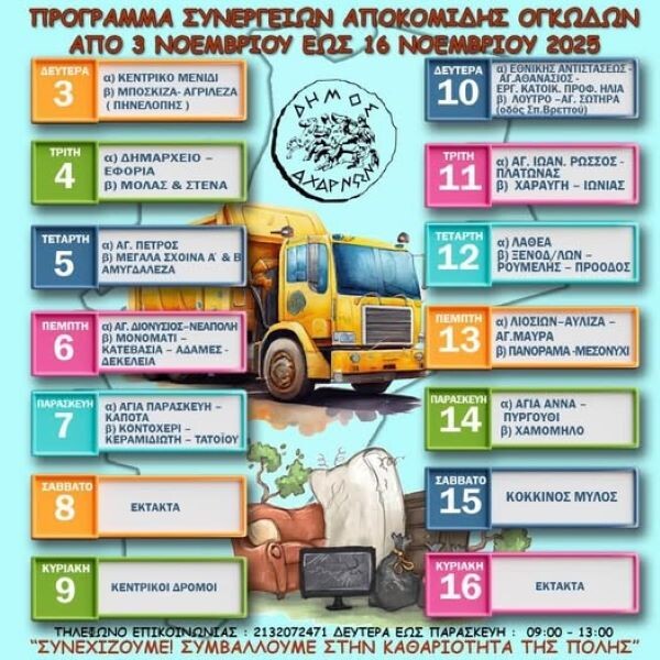 Η Διεύθυνση Καθαριότητας και Ανακύκλωσης του Δήμου Αχαρνών ανακοινώνει το πρόγραμμα αποκομιδής ογκωδών αντικειμένων από τις 3 έως τις 16 Νοεμβρίου.