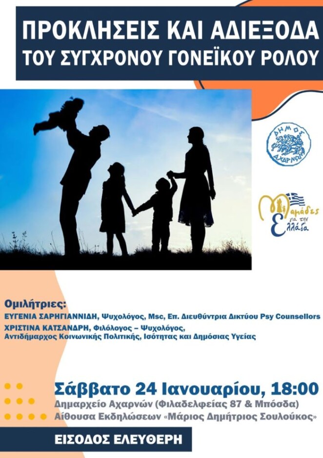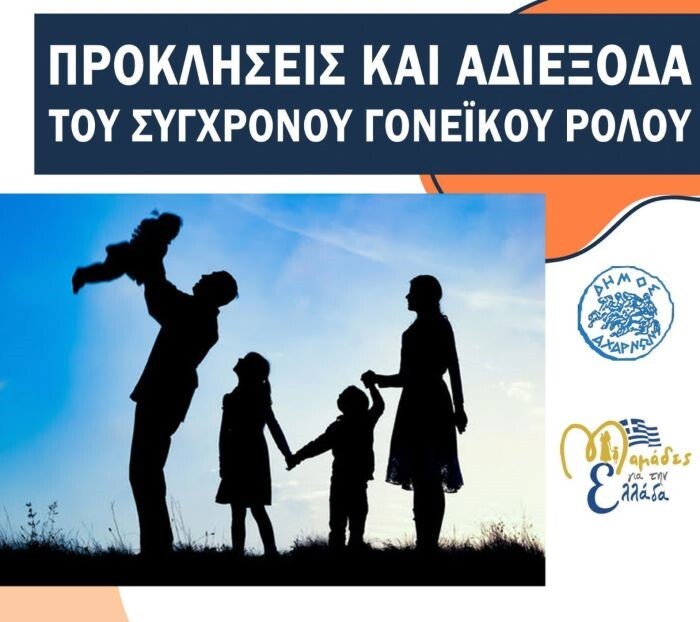 Ο Δήμος Αχαρνών και ο σύλλογος Μαμάδες για την Ελλάδα σας προσκαλούν σε εκδήλωση με τίτλο «Προκλήσεις και αδιέξοδα του σύγχρονου γονεϊκού ρόλου». Σε μια κοινωνία που αλλάζει η οικογένεια παίζει σημαντικό ρόλο και ο ρόλος του γονέα αντιμετωπίζει πολυποίκιλες προκλήσεις.