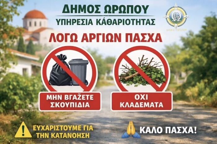 Η Υπηρεσία Καθαριότητας του Δήμου Ωρωπού ενημερώνει τους πολίτες ότι, λόγω των αργιών των εορτών του Πάσχα, παρακαλούνται να μην εναποθέτουν στους δρόμους και στους κοινόχρηστους χώρους οικιακά απορρίμματα και προϊόντα κλαδέματος κατά τις ημέρες που δεν θα πραγματοποιείται κανονικά η αποκομιδή.
