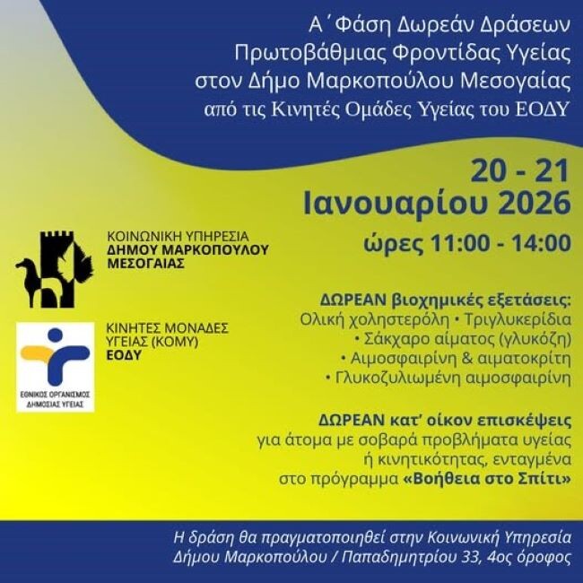 Δωρεάν δράσεις Πρωτοβάθμιας Φροντίδας Υγείας (ΠΦΥ), με στόχο την ενίσχυση της πρόληψης και τη βελτίωση της πρόσβασης των πολιτών σε βασικές υπηρεσίες υγείας, υλοποιεί η Κοινωνική Υπηρεσία του Δήμου Μαρκοπούλου Μεσογαίας, σε συνεργασία με τις Κινητές Ομάδες Υγείας (ΚΟΜΥ) του Εθνικού Οργανισμού Δημόσιας Υγείας (ΕΟΔΥ), κατόπιν πρωτοβουλίας της Αντιδημάρχου Παιδείας, Κοινωνικής Πολιτικής και Αλληλεγγύης, Παιδικής Μέριμνας και Οικογένειας, Αθλητισμού και Νεολαίας Μένης Βαμποράκη.