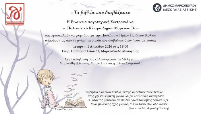 Η Γυναικεία Λογοτεχνική Συντροφιά σε συνεργασία με το Δήμο Μαρκοπούλου, στο πλαίσιο του προγράμματος «Τα βιβλία που διαβάζαμε», αναβιώνει την παλαιότερη δράση της αγαπημένης μας συγγραφέως Αγγελικής Βαρελλά και σας καλούν να γιορτάσουμε την Παγκόσμια Ημέρα Παιδικού Βιβλίου, ανασύροντας από τη μνήμη τα βιβλία που διαβάζαμε όταν ήμασταν παιδιά.