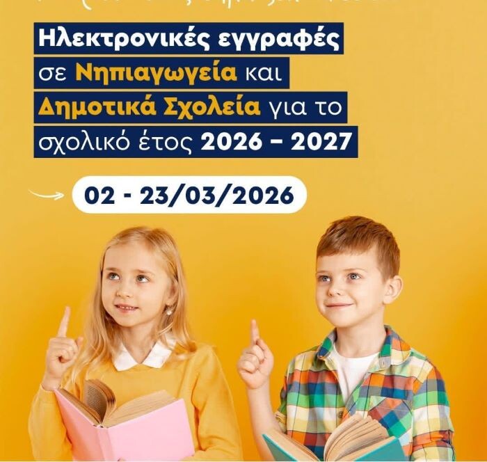 Ξεκινούν οι ηλεκτρονικές εγγραφές σε Νηπιαγωγεία και Δημοτικά Σχολεία για το σχολικό έτος 2026-2027.