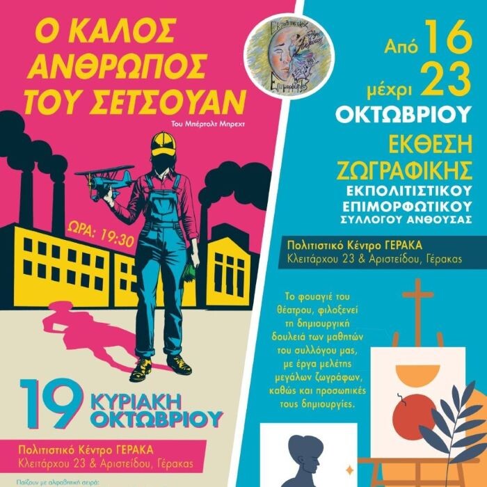 Ο Εκπολιτιστικός Επιμορφωτικός Σύλλογος Ανθούσας με την υποστήριξη του Δήμου Παλλήνης, Τμήμα Πολιτισμού, παρουσιάζει την Κυριακή 19 Οκτωβρίου 2025 και ώρα 19:30 την θεατρική παράταση «Ο καλός άνθρωπος του Σετσουάν» του Μπέρτολτ Μπρεχτ στο Πολιτιστικό Κέντρο Γέρακα.