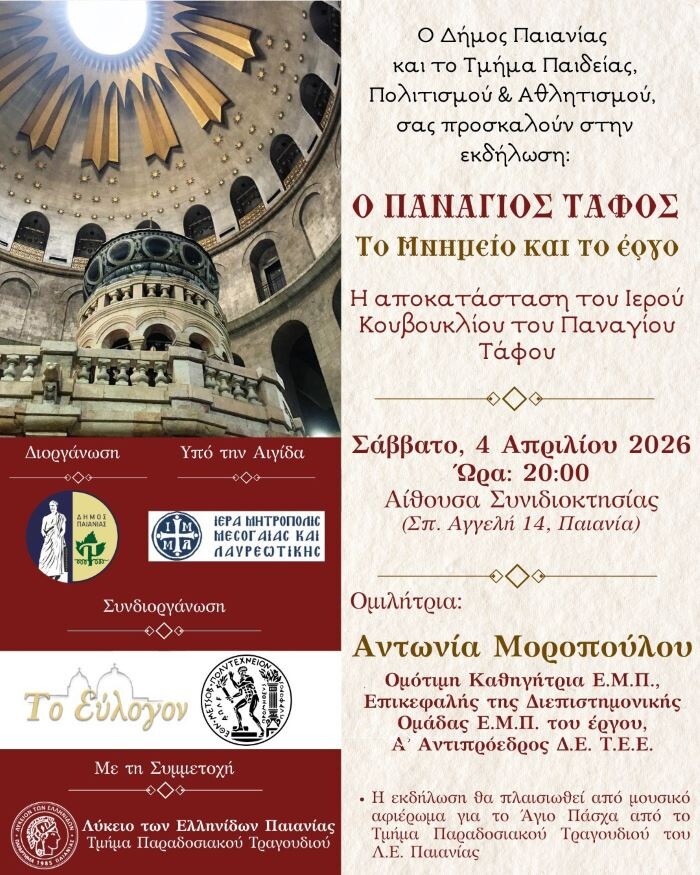 Ο Δήμος Παιανίας και το Τμήμα Παιδείας, Πολιτισμού & Αθλητισμού, σας προσκαλούν στην εκδήλωση: «Ο ΠΑΝΑΓΙΟΣ ΤΑΦΟΣ: Το μνημείο & το έργο – Η αποκατάσταση του Ιερού Κουβουκλίου του Παναγίου Τάφου»