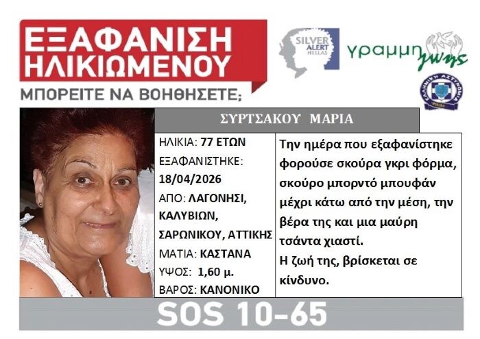 Η Μαρία Συρτσάκου, 77 ετών, εξαφανίστηκε στην περιοχή του Λαγονησίου, στα Καλύβια Θορικού του Δήμου Σαρωνικού Αττικής, το πρωί της 18/04/26, όταν γνωστός της την αποβίβασε στη στάση λεωφορείου, της γραμμής Σαρωνίδα – Σταθμός Αργυρούπολης (122) στη “Διασταύρωση Καλυβίων” (Λαγονήσι) επί της Λεωφόρου Καλυβίων και Λεωφόρου Αθηνών-Σουνίου, για να πάρει το λεωφορείο και να επιστρέψει στο σπίτι της, στην Καλλιθέα Αττικής. Με το λεωφορείο αυτό θα κατέβαινε στην στάση “Πλατεία Βάρκιζας” για να πάρει από εκεί το Λεωφορείο Α2 και να κατέβει στη Λεωφόρο Συγγρού, από όπου θα πήγαινε στο σπίτι της στην Καλλιθέα, μια διαδρομή την οποία είχε κάνει πολλές φορές. Δεν γνωρίζουμε αν εν τέλει ανέβηκε στο λεωφορείο ή αν έκανε κάποια στάση στην διαδρομή. Έκτοτε, αγνοείται.