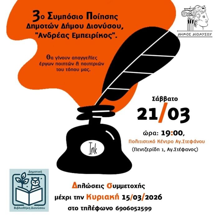 Ο Δήμος Διονύσου και η Δημοτική Βιβλιοθήκη Διονύσου διοργανώνουν το 3ο Συμπόσιο Ποίησης Δημοτών «Ανδρέας Εμπειρίκος», μια ξεχωριστή βραδιά αφιερωμένη στους ποιητές και τις ποιήτριες του τόπου μας.