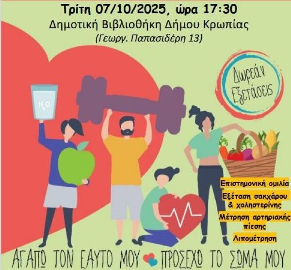 Ο Δήμος Κρωπίας, το ΚΕΠ Υγείας και το Ελληνικό Διαδημοτικό Δίκτυο Υγιών Πόλεων του Π.Ο.Υ. (ΕΔΔΥΠΠΥ) σας προσκαλούν στη δράση: