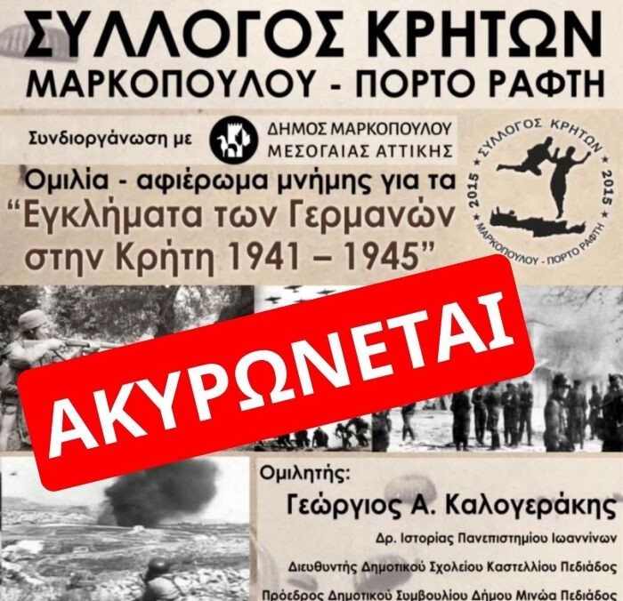 .Ο Δήμος Μαρκοπούλου Μεσογαίας και η Αντιδημαρχία Πολιτισμού και Μέριμνας για την 3η Ηλικία, σας ενημερώνουν, ότι η ομιλία – αφιέρωμα μνήμης με θέμα «Τα Εγκλήματα των Γερμανών στην Κρήτη 1941 – 1945», που είχε προγραμματιστεί να πραγματοποιηθεί την Κυριακή 29 Μαρτίου 2026 και ώρα 11:00 π.μ. στο Δημοτικό Κινηματοθέατρο Μαρκοπούλου «Άρτεμις», σε συνδιοργάνωση με τον Σύλλογο Κρητών Μαρκοπούλου – Πόρτο Ράφτη, ακυρώνεται για σοβαρούς λόγους υγείας.