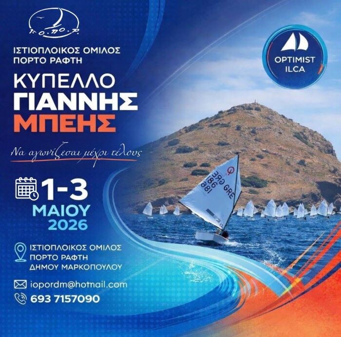 Ο Ιστιοπλοϊκός Όμιλος Πόρτο Ράφτη (Ι.Ο.ΠΟ.Ρ.) του Δήμου Μαρκοπούλου, διοργανώνει OPEN Πανελλήνιο Διασυλλογικό Αγώνα “ΚΥΠΕΛΛΟ ΓΙΑΝΝΗΣ ΜΠΕΗΣ” για σκάφη τύπου OPTIMIST, ILCA 4 (LASER 4) την Παρασκευή 1, το Σάββατο 2 & την Κυριακή 3 Μαΐου 2026, φιλοξενώντας αθλητές/αθλήτριες από ομίλους από όλη την Ελλάδα, ηλικίας από 8 έως 16 ετών.