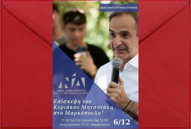 Αύριο τα γραφεία της ΔΕΕΠ Ανατολικής Αττικής στο Μαρκόπουλο υποδέχονται μια ξεχωριστή τιμή. Ο Πρωθυπουργός και Πρόεδρός μας, Κυριάκος Μητσοτάκης, θα βρίσκεται κοντά μας στις 11:30 για μια ανοιχτή συζήτηση με τα στελέχη και τους πολίτες της περιοχής. Είναι μια ευκαιρία να αναδείξουμε το έργο που γίνεται, να ακούσουμε, αλλά και να μιλήσουμε με ειλικρίνεια για όσα μας απασχολούν.