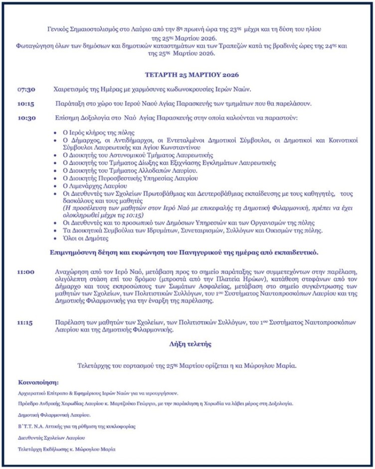 Γενικός Σημαιοστολισμός στο Λαύριο από την 8η πρωινή ώρα της 23ης μέχρι και τη δύση του ηλίου της 25ης Μαρτίου 2026.