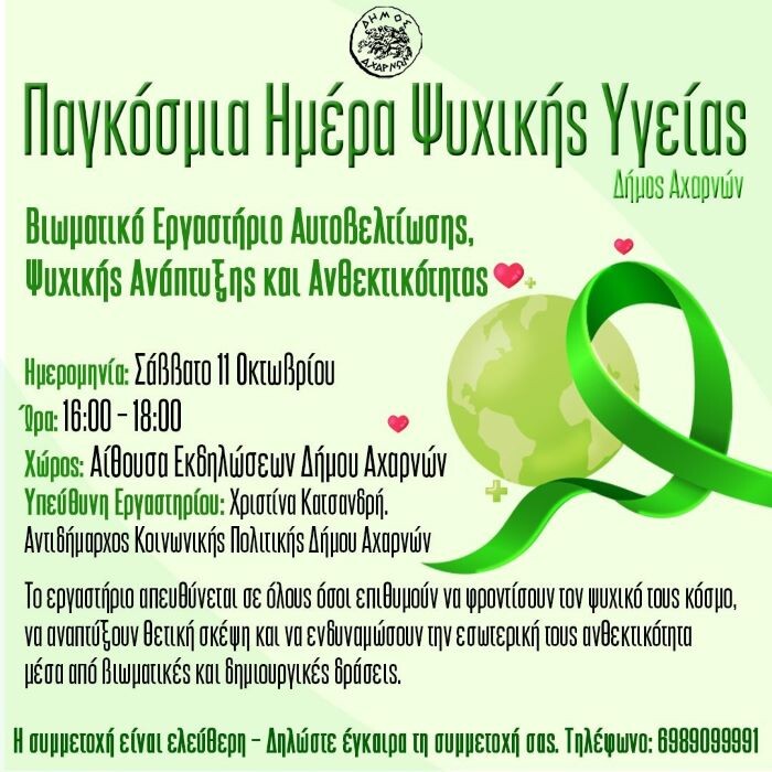 Με αφορμή την Παγκόσμια Ημέρα Ψυχικής Υγείας, ο Δήμος Αχαρνών διοργανώνει ένα βιωματικό εργαστήριο Αυτοβελτίωσης, Ψυχικής Ανάπτυξης και Ανθεκτικότητας, αφιερωμένο στην ενδυνάμωση, την εσωτερική ισορροπία και τη θετική στάση ζωής.Ημερομηνία: Σάββατο 11 Οκτωβρίου